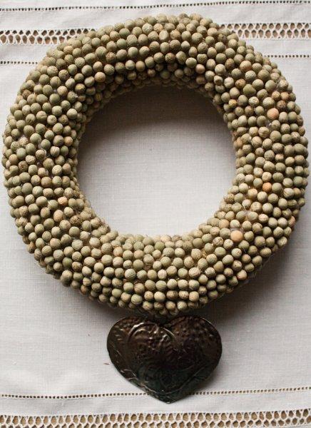 Dit keer niet, maar ik bedacht me wel dat ik nog niet zo lang geleden een krans heb gemaakt van gedroogde erwten. Ik moet erbij vermelden dat ik dit een keer op een blog had gezien, dus dit heb ik niet zelf bedacht. Het was een hele toer om zoveel erwten op een krans te plakken, maar ik was er zelf best tevreden over...